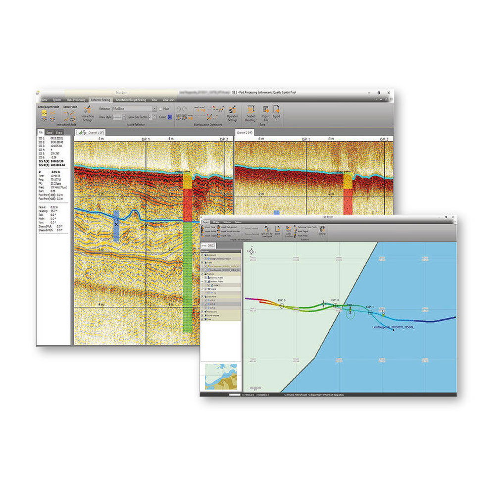 A project-based workflow allows intuitive handling of 2D seismic sections together with a GIS map window. The processing includes signal filtering, noise reduction, tide and vertical corrections, cleaning of external sensor data, picking of seabed and sub-seabed reflectors and targets and the overlay of external probe and core data to assist interpretation.